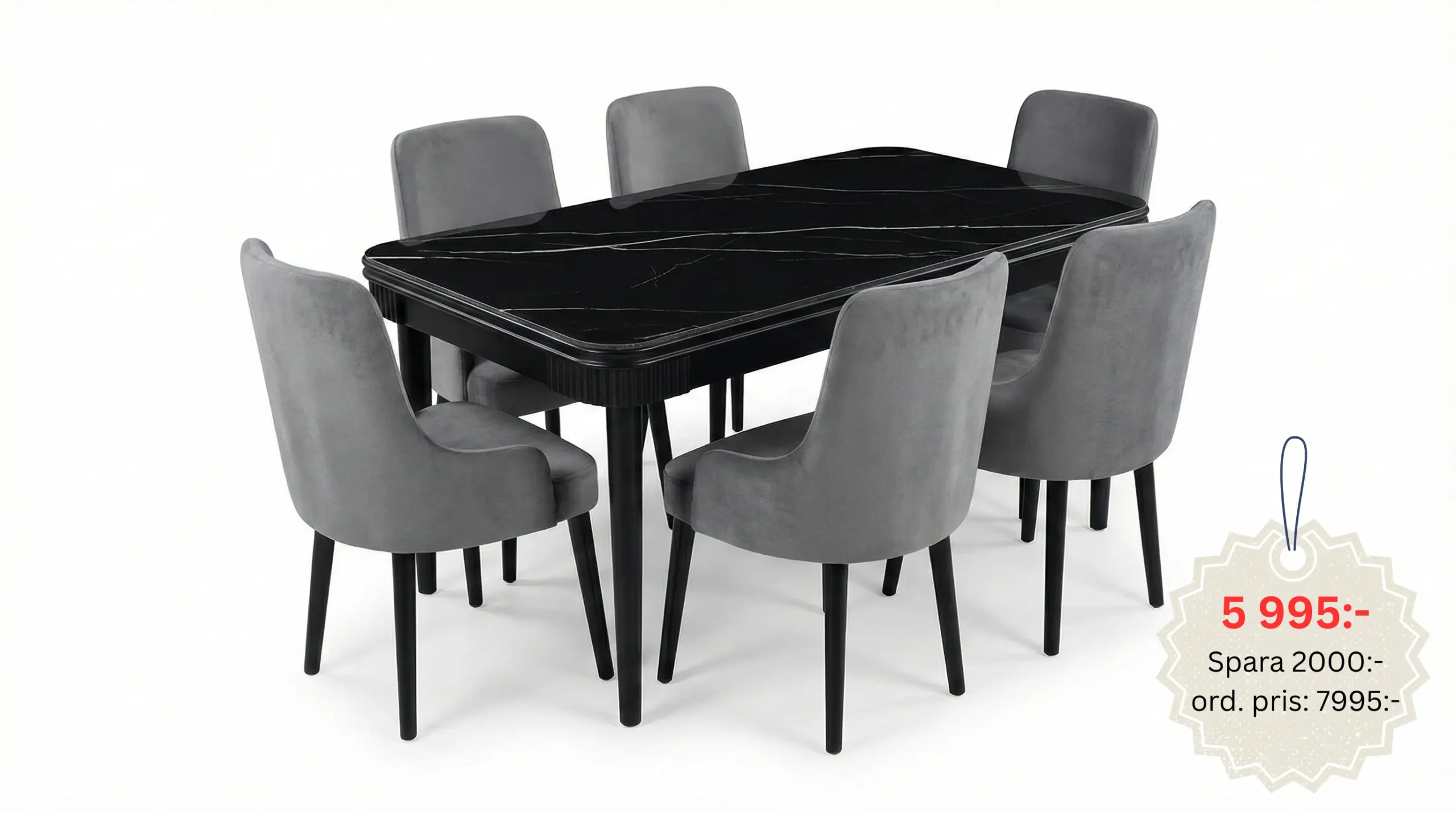 Mörk Marmor Matbord & 6 Stolar (Svart)