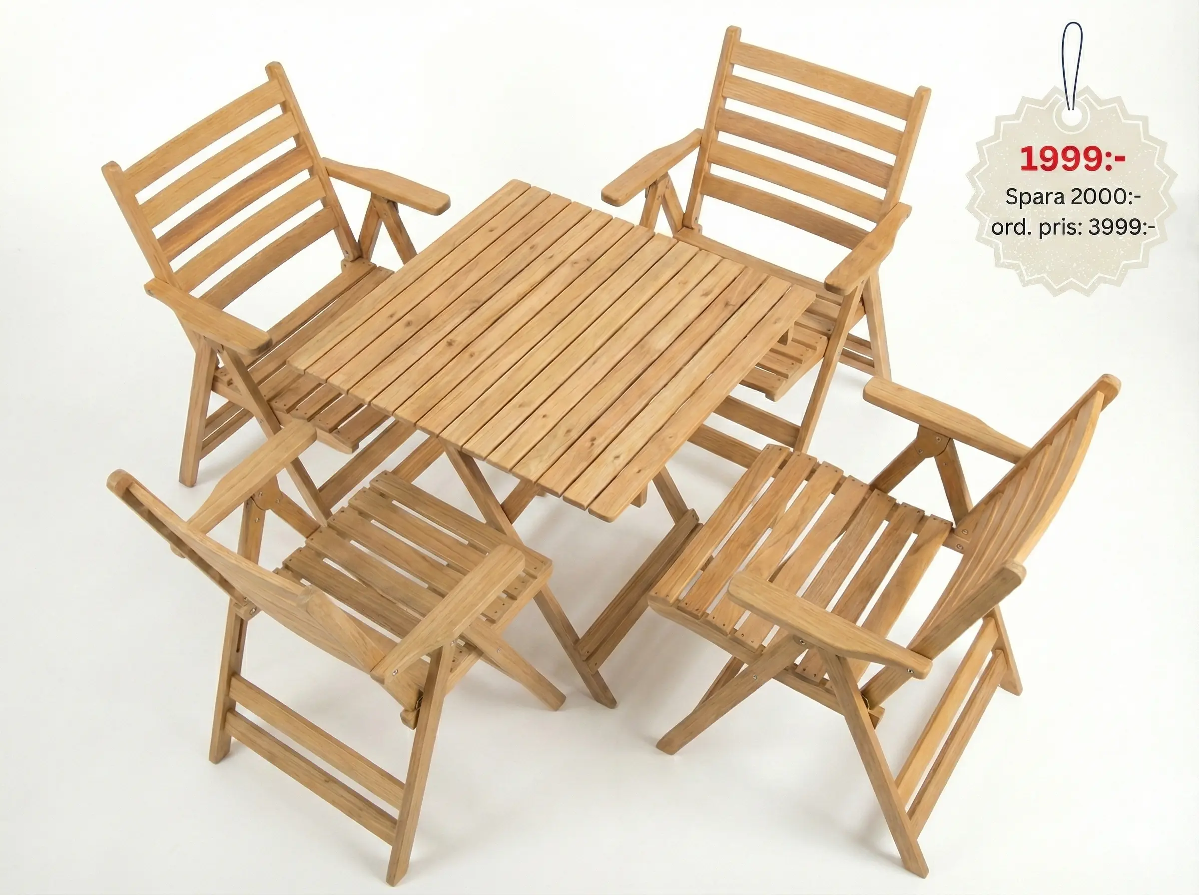 Förbered dig för sommaren! Det här praktiska trädgårdssetet i ekträ inkluderar ett bord och fyra fällbara stolar. Robust, stilrent och enkelt att förvara – nu halva priset!